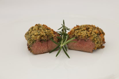 2 Stücke feiner Lammrücken mit einer Kruste aus Rosmarin und Thymian mit Kerntemperatur auf 56 Grad zubereitet. Dazu gibt es die passende Soße aus dem Fond.