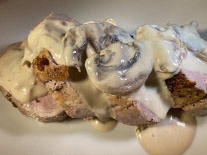 1 kg Schweinefilet in einer Soße aus frischen Champignons und Sahne
