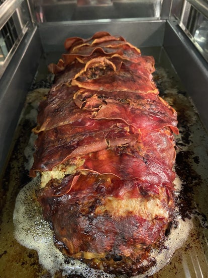 1 kg zarter Schweinebraten über Nacht gegart und mit Schwarzbier verfeinert.