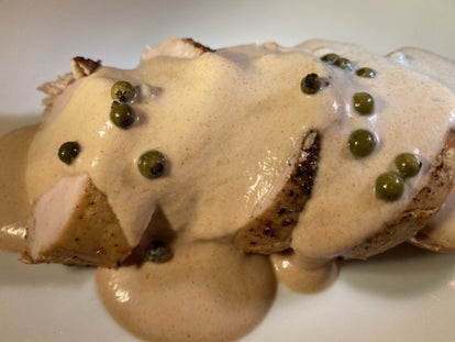 1 kg Schweinefilet in einer Soße aus eingelegten Pfefferkörnern, Rotwein, Sahne und Tomaten